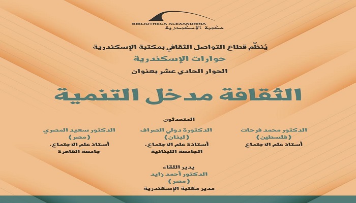 تنظّم مكتبة الإسكندرية الحوار الحادي عشر من سلسلة «حوارات الإسكندرية» تحت عنوان «الثقافة مدخل للتنمية»، وذلك يوم الأحد 30 نوفمبر 2025، في تمام الساعة الثانية عشرة ظهرًا بقاعة الوفود بمركز المؤتمرات.