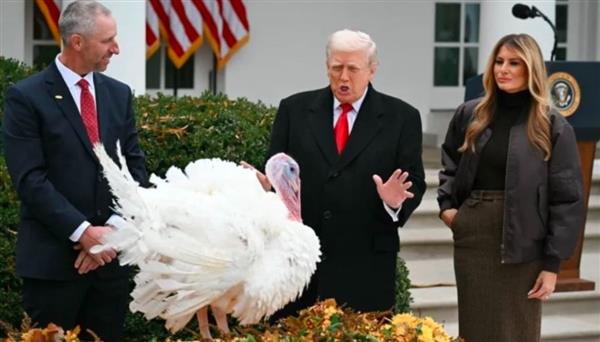 وظهر ترامب في فيديو وهو يخاطب الديك الرومي قائلًا: "هل أنت جاهز غوبل؟.. سأخبرك أمرًا مهمًا للغاية، لقد عفوت عنك بلا قيد أو شرط"، ثم مد يده ليلمس ريش الطائر قائلًا: "من الذي قد يرغب في إيذاء هذا الطائر الجميل؟".