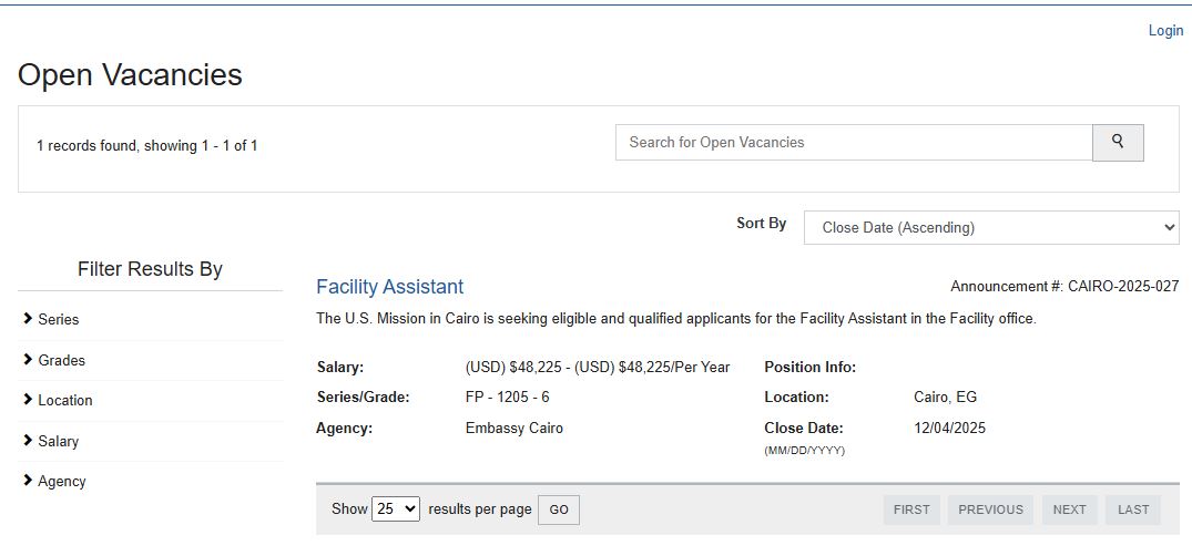 ويركز الإعلان الحالي على وظيفة “مساعد مرافق – Facilities Assistant” ضمن فئة موظفي البعثات المحلية (LE Staff)، وبدرجة وظيفية تعادل FP-4 في السلم الدبلوماسي الأمريكي.