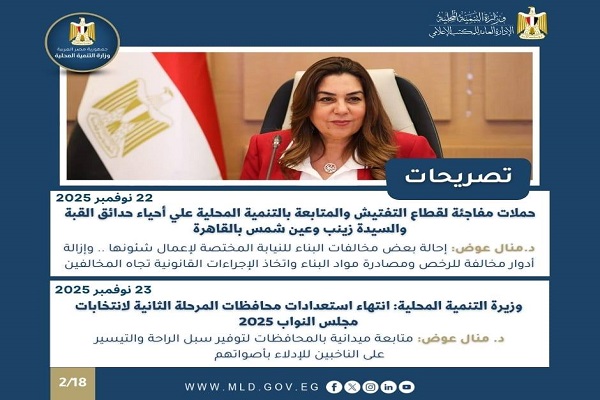 وأعلنت وزيرة التنمية المحلية، عن قيام لجنة من قطاع التفتيش والرقابة والمتابعة بالوزارة بالمرور المفاجئ خلال شهر نوفمبر الجاري على أحياء السيدة زينب وحدائق القبة وعين شمس بمحافظة القاهرة لمتابعة سير العمل ورفع كفاءة الأداء وضمان الإنضباط الإداري والميداني وتحسين جودة الخدمات المقدمة للمواطنين والحد من البناء المخالف ومراجعة ملفات التصالح والتقنين، المتغيرات المكانية ومتابعة أعمال تنفيذ مشروعات الخطة الاستثمارية والإيرادات والشئون المالية ومنظومة النظافة والحملة الميكانيكية والإشغالات والإعلانات والأسواق وأداء المركز التكنولوجي وحل مشاكل المواطنين .