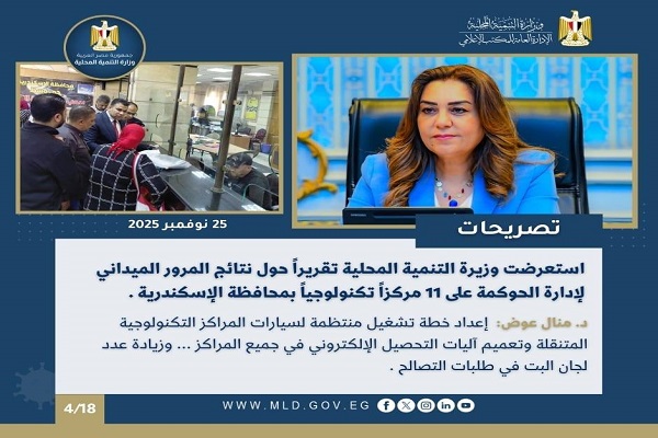 وتلقت وزيرة التنمية المحلية والقائم بأعمال وزيرة البيئة ، تقريراً من الإدارة العامة للمراجعة الداخلية والحوكمة حول نتائج المرور الميداني الذي نفذته فرق الوزارة على عدد 15 مركزاً تكنولوجياً بعدد من الأحياء والمراكز والمدن بمحافظة الإسكندرية خلال شهر نوفمبر 2025 وذلك فى (الجمرك – العامرية أول – العامرية ثان – العجمي – المنتزة أول – المنتزة ثان – شرق الإسكندرية – غرب الإسكندرية – وسط الإسكندرية - الديوان العام – برج العرب) لمتابعة مستوى الخدمات المقدمة للمواطنين وقياس مدى رضاهم عنها، والوقوف على معدلات الأداء في الملفات الخدمية اليومية.