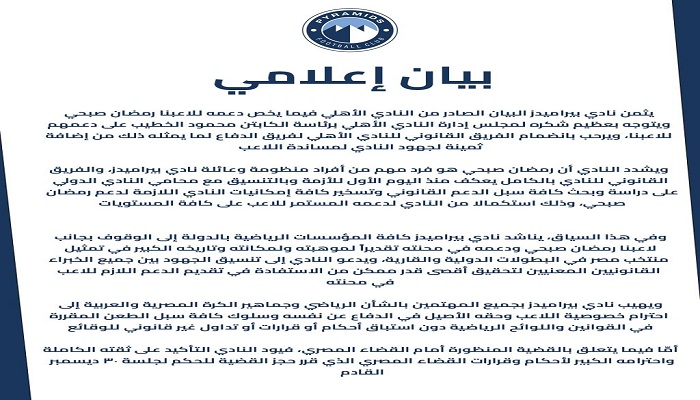 يثمن نادي بيراميدز البيان الصادر من النادي الأهلي فيما يخص دعمه للاعبنا رمضان صبحي، ويتوجه بعظيم شكره لمجلس إدارة النادي الأهلي برئاسة محمود الخطيب على دعمهم للاعبنا، ويرحب بانضمام الفريق القانوني للنادي الأهلي لفريق الدفاع لما يمثله ذلك من إضافة ثمينة لجهود النادي لمساندة اللاعب