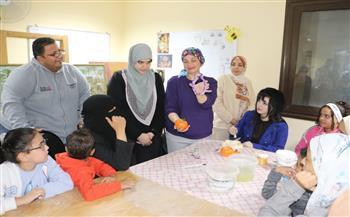 أما في ورشة الكونكريت واصلت المدربة سهام إسماعيل تدريب الشباب على تشكيل وصقل القطع الجبسية، مع إضافة لمسات التلوين والطلاء، لإنتاج وحدات ديكورية مبتكرة يسهل تسويقها.