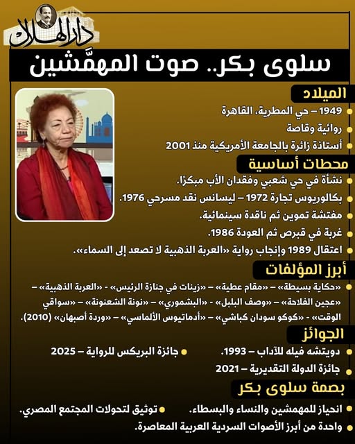 في زحام المدينة الصاخبة، حيث تتلاشى الأصوات الخافتة وتُطمس ملامح المهمشين، نبتت شجرة أدبية من تربة حي «المطرية» الشعبي، امتدت جذورها في أعماق الوجع المصري، وتفرعت أغصانها لتروي حكايات من لا صوت لهم إنها الأديبة المصرية المتميزة سلوى بكر.