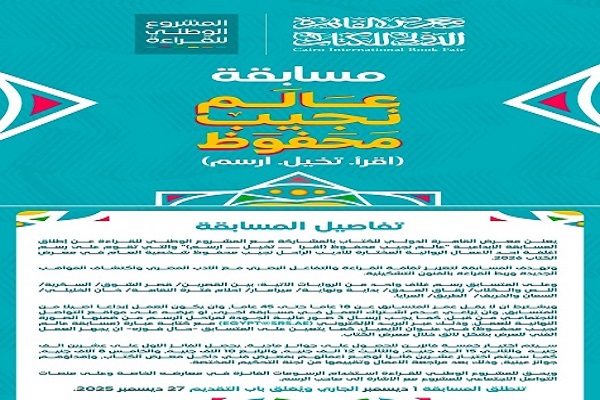في إطار الاحتفاء بالأديب العالمي نجيب محفوظ، شخصية العام لمعرض القاهرة الدولي للكتاب 2026، تطلق الهيئة المصرية العامة للكتاب بالشراكة مع "البحث العلمي للاستثمار" الراعية للمشروع الوطني للقراءة مسابقة "عالم نجيب محفوظ" الموجهة للمواهب الفنية الشابة، بهدف تعزيز ثقافة القراءة وربط الأدب المصري بالفنون البصرية، حيث يبدأ التقديم للمسابقة من اليوم، ويستمر حتى 27 ديسمبر الجاري، على أن يتم توزيع الجوائز خلال فعاليات معرض القاهرة الدولي للكتاب.