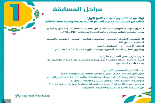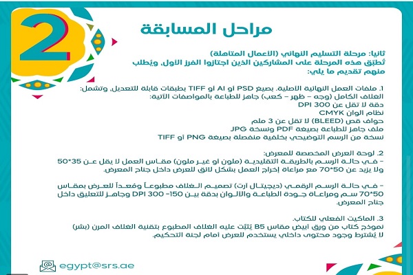 كما يجب إرسال 3 صور عالية الجودة لمراحل الرسم من ضمنها الصورة النهائية، كما يتعين على المتسابق -حال فوزه- أن يجهز العمل الفني للعرض بشكل لائق خلال معرض الكتاب 2026.