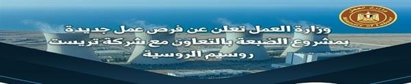 أعلنت وزارة العمل، في إطار توجيهات الوزير محمد جبران بتوفير فرص عمل لائقة للشباب ورفع معدلات التشغيل بالمشروعات القومية، عن إتاحة مجموعة من الوظائف الفنية الجديدة بالتعاون مع شركة تريست روسيم، إحدى الشركات المنفذة لأعمال الإنشاءات داخل محطة الضبعة النووية.