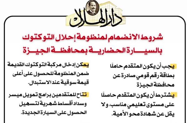 شروط الانضمام لمنظومة إحلال التوكتوك بالسيارة الحضارية بمحافظة الجيزة