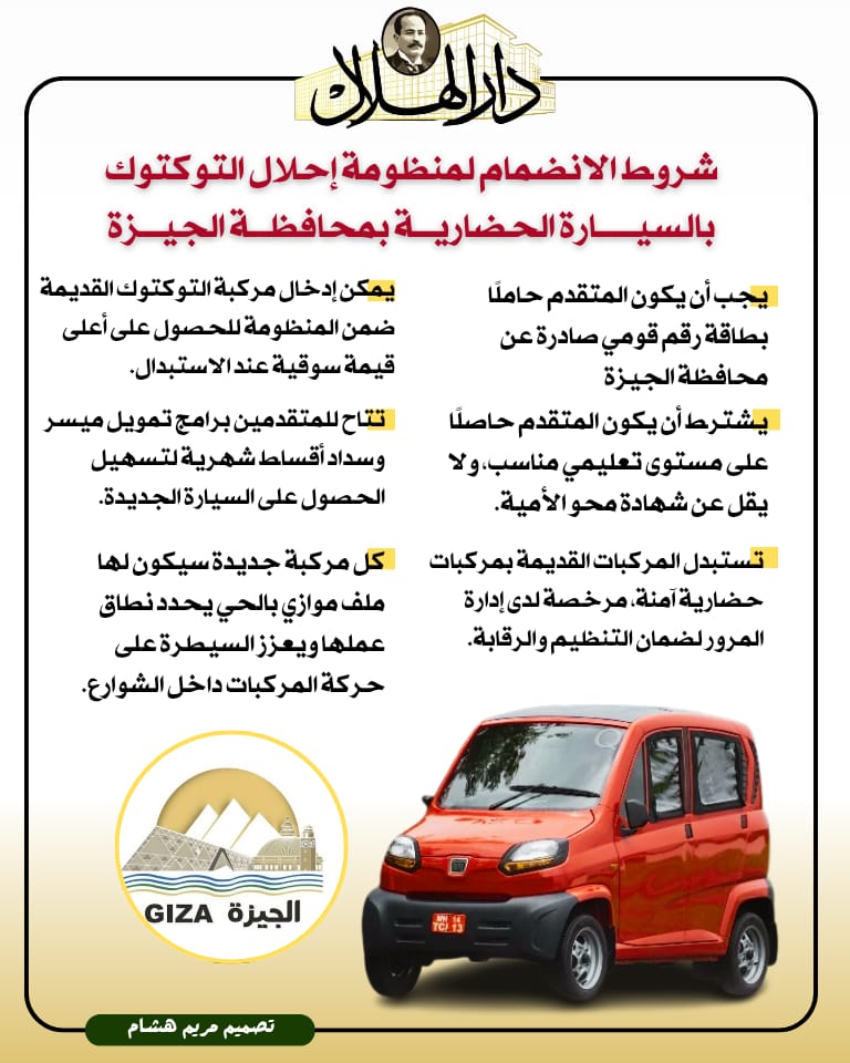 وكان المهندس عادل النجار محافظ الجيزة، قد أعلن في وقت سابق عن آلية العمل والاشتراطات الخاصة بالانضمام إلى منظومة إحلال مركبات التوكتوك بالسيارات الحضارية الصغيرة.