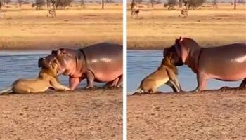 تداول مستخدمو مواقع التواصل الاجتماعي مقطع فيديو صادم يرصد معركة بين فرس نهر وأسد، انتهت بشكل غير متوقع بهزيمة ملك الغابة.