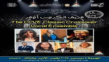 يستضيف بيت الغناء العربي بقصر الأمير بشتاك بشارع المعز أمسية غنائية لفرقة The CCVE – Classic Crossover Vocal Ensembleوذلك في تمام الثامنة مساء اليوم الجمعة 5 ديسمبر، وذلك في إطار استراتيجية صندوق التنمية الثقافية الهادفة إلى إتاحة تجارب فنية متنوعة، ودعم الفرق الشابة والمواهب الواعدة في مختلف مجالات الفنون.