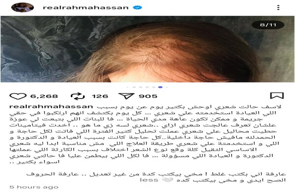 وكتبت رحمة عبر حسابها الرسمي على موقع التواصل الاجتماعي لتبادل الصور والفيديوهات إنستجرام: "للأسف حالت شعري أوحش بكتير يوم عن يوم بسبب اللي العيادة استخدمته على شعري.. كل يوم بكتشف إنهم ارتكبوا في حقي جريمة وممكن تكون عاهة مدى الحياة."