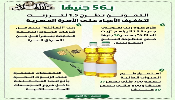 في خطوة تهدف إلى تخفيف الأعباء المعيشية على المواطنين، أعلنت وزارة التموين والتجارة الداخلية عن طرح عبوة زيت تمويني جديدة بسعة 1.5 لتر تحت اسم "زيت العائلة" بسعر رسمي يبلغ 56 جنيهًا، وتأتي هذه المبادرة ضمن جهود الوزارة لتوفير السلع الأساسية بأسعار مناسبة للأسر المصرية.