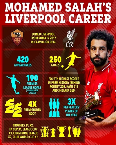 صحيفة ذا صن البريطانية الشهيرة، نشرت تقريرًا عن أرقام محمد صلاح مع ليفربول، وعلقت عليه: "لن يكون هناك محمد صلاح آخر، مع شعار الأفضل."