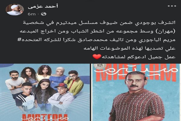 كتب الفنان أحمد عزمي على موقع التواصل الاجتماعي فيسبوك: أتشرف بوجودي ضمن ضيوف مسلسل ميدتيرم في شخصية (مهران) وسط مجموعه من أشطر الشباب ومن اخراج المبدعه مريم الباجوري ومن تاليف محمدصادق شكرا للشركة المتحدة علي تصديها لهذه الموضوعات الهامة عمل جميل ادعوكم لمشاهدته.