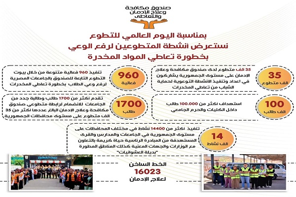 وكان الدكتور عمرو عثمان مدير صندوق مكافحة وعلاج الإدمان والتعاطي قد أكد حرص الصندوق على الارتقاء بدور الشباب في منظومة العمل التطوعي بأبعادها المختلفة وبناء قدراتهم لتمكينهم من المشاركة الفاعلة في القضايا التنموية لاسيما البرامج التوعوية لمكافحة تعاطى المخدرات ،و أن من ضمن المهام الوظيفية للشباب المتطوعين لدى صندوق مكافحة الإدمان والبالغ عددهم أكثر من 35 ألف متطوع على مستوى كافة محافظات الجمهورية ، المشاركة في إعداد الخطط والاستراتيجيات التي يضعها الصندوق للوقاية من تعاطي المخدرات وتنفيذ الأنشطة التوعوية لحماية الشباب من الوقوع في براثن الإدمان، بجانب التنظيم لكافة الفعاليات والبرامج والأنشطة التي يقرها الصندوق كذلك المشاركة المستمرة بكافة فعاليات الأعياد القومية والعالمية. كما يتم العمل على استثمار طاقات الشباب الإيجابية وإعداد برامج تدريبية تؤهلهم كقيادات للعمل التطوعي، بجانب العمل على زيادة قدرات الشباب المعرفية والمهارية فى مجال خفض الطلب على المخدرات، حيث يتم إعداد مجموعة من القيادات الشابة الذين تم اختيارهم كقيادات فى العمل التطوعي بالمحافظات المختلفة وتنفيذ مبادرات ميدانية للتواصل المباشر مع الجمهور وتعريفهم بصندوق مكافحة الإدمان وخدماته الوقائية والعلاجية والرد على الاستفسارات التي تدور في الأذهان عن طبيعة مرض الإدمان وإمكانية العلاج من خلال الخط الساخن "16023" كما يتم تدريب الشباب المتطوعين لدى الصندوق على المحتوى المعرفي لقضية الإدمان وتعاطى المخدرات وأنواعها وتأثيراتها، وكذلك الأفكار والمعتقدات الخاطئة ومسببات الإدمان والوقوع فيها وكيفية الوقاية منها، وذلك من خلال اختيار أفضل الكوادر لتكوين وحدات تطوعية بجميع المحافظات، ويتم تأهيل هؤلاء الشباب لتمثيل الصندوق في الملتقيات الشبابية واللقاءات الكشفية والجوالة وكافة فعاليات وأنشطة الصندوق بجانب تنفيذ العديد من البرامج والأنشطة المختلفة في مجال التوعية بأضرار تعاطي المخدرات بهدف رفع الوعي لدى الفئات المختلفة بخطورة الإدمان.