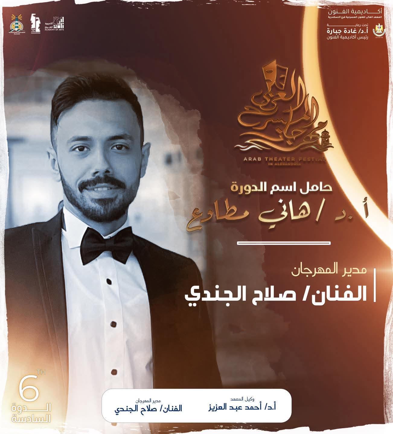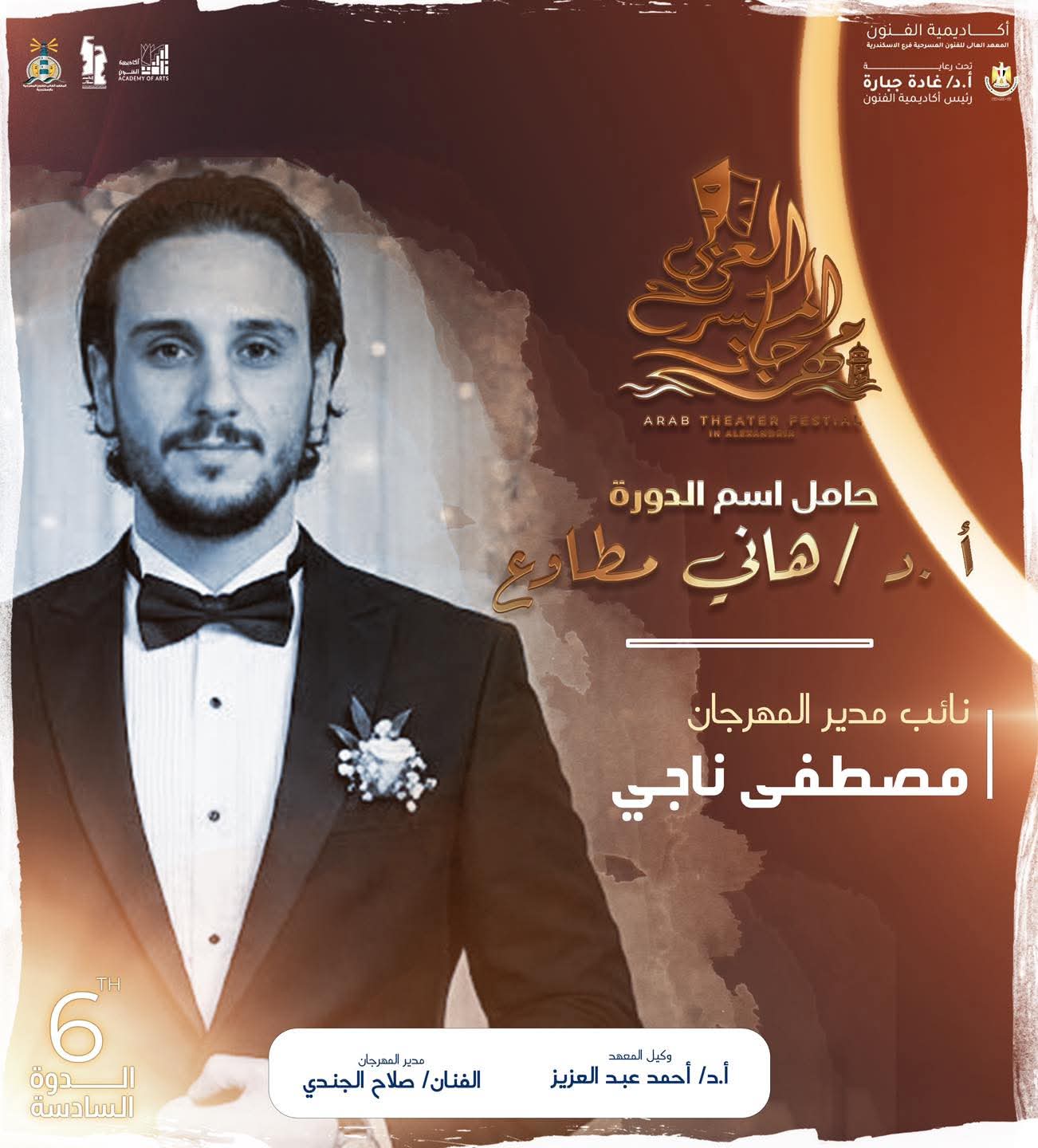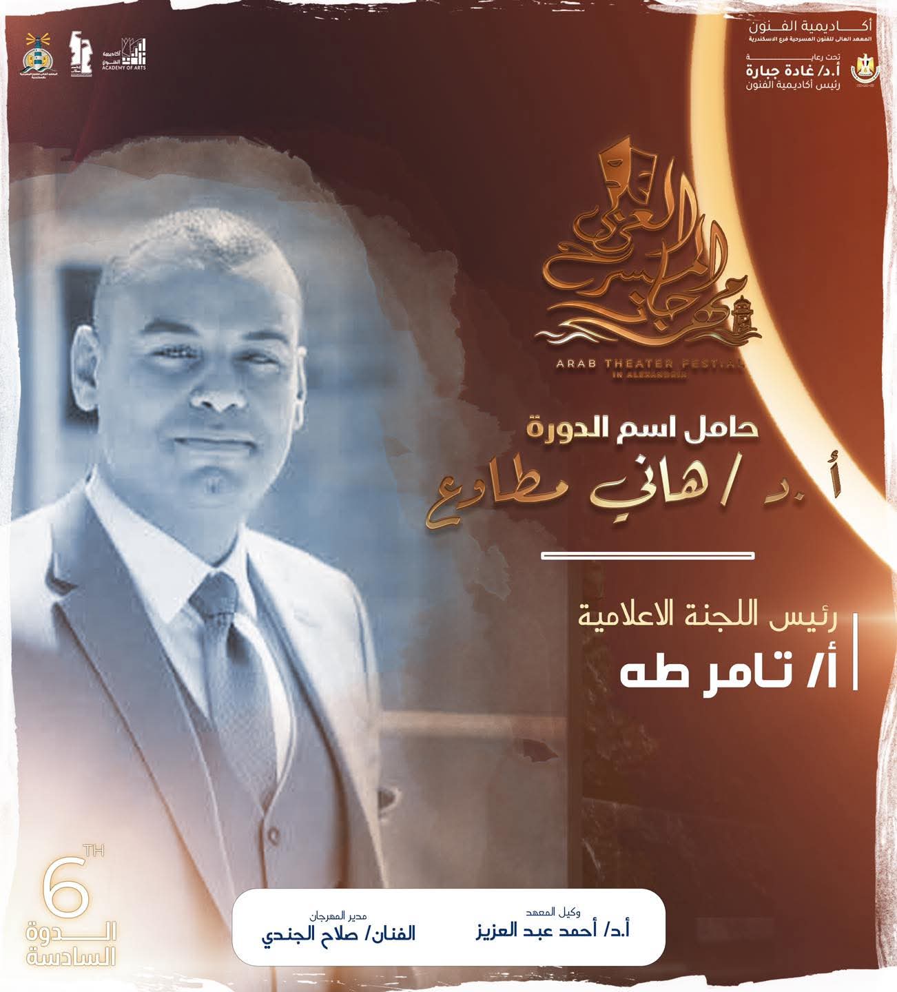 تصدرت القيادات الشبابية مناصب الهيكل الإداري لمهرجان المسرح العربي في دورته السادسة، وضم الهيكل عدد من الأسماء المميزة من شباب المعهد العالي للفنون المسرحية بالإسكندرية، وهم الفنان صلاح الجندي مدير المهرجان، الفنان مصطفي ناجي نائب مدير المهرجان، الفنان تامر طه رئيس اللجنة الإعلامية، الفنانة داليا سمير منسق عام المهرجان، الفنان أشرف علي مخرج حفل الافتتاح والختام، الفنانة سوزي الشيخ لجنة العلاقات العامة، الفنان مينا صلاح مسئول الهُوِيَّة البصرية والفنان معاذ مدحت لجنة التجهيزات الفنية.