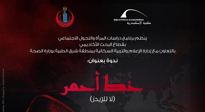 ينظم برنامج دراسات المرأة والتحول الاجتماعي التابع لقطاع البحث الأكاديمي بمكتبة الإسكندرية، بالتعاون مع إدارة الإعلام والتربية السكانية بمنطقة شرق الطبية بوزارة الصحة، ندوة بعنوان «خط أحمر»، وذلك يوم الأربعاء الموافق 17 ديسمبر 2025، من الساعة الخامسة إلى الثامنة مساءً، بمركز المؤتمرات – قاعة المحاضرات بمكتبة الإسكندرية.