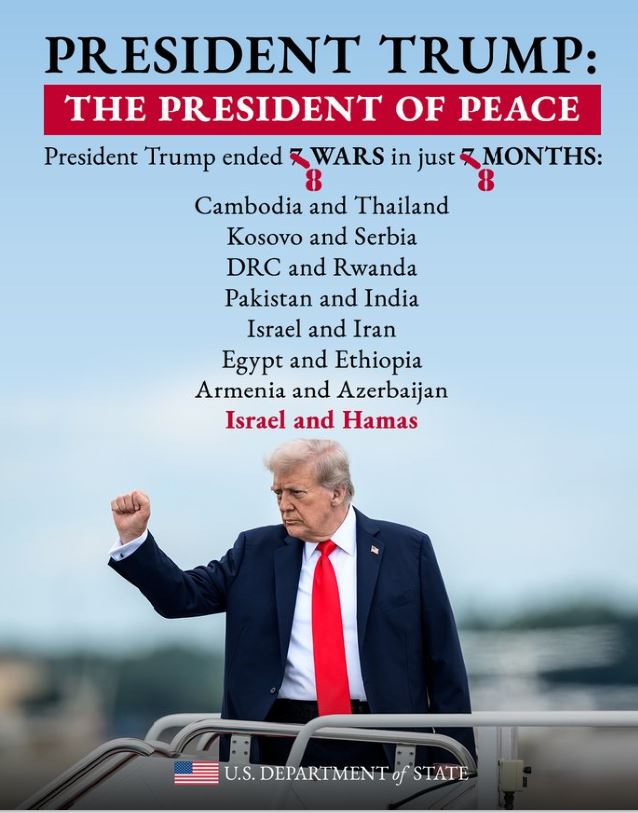 وجاء في تغريدة وزارة الخارجية الأميركية أن الرئيس ترامب أنهى 8 حروب خلال 8 أشهر فقط.