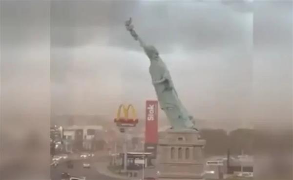 وفي الفيديو، يظهر التمثال وهو يتمايل أمام الرياح العاتية، لينحني ببطء أمام أعين المارة العاجزين، قبل أن يستسلم تمامًا ويرتطم بالأرض.