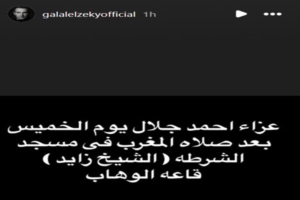 وكتب جلال الزكي عبر خاصية الاستوري على موقع التواصل الاجتماعي لتبادل الصور والفيديوهات الإنستجرام: عزاء احمد جلال يوم الخميس بعد صلاه المغرب في مسجد الشرطه ( الشيخ زايد ) قاعه الوهاب
