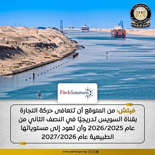 أكدت وكالة "فيتش" أن حركة التجارة بقناة السويس ستشهد تعافيًا تدريجيًا في النصف الثاني من عام 2025/2026 بعد وقف إطلاق النار في غزة، وتوقعت عودة حركة السفن بالقناة إلى مستويات ما قبل الحرب خلال عام 2026/2027.