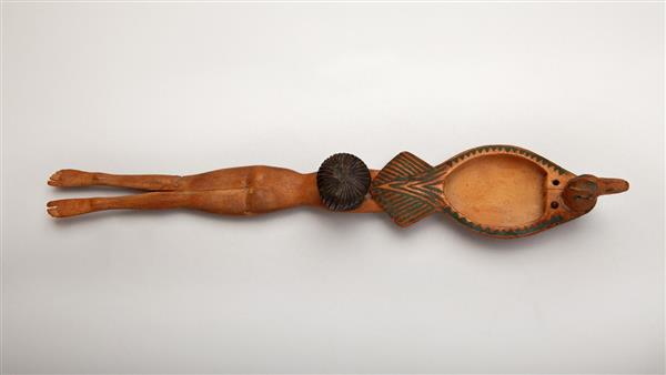صُنعت الملعقة من الخشب غير محدد النوع، وزُينت بصبغة غير محددة، ويبلغ ارتفاعها 6.20 سم، وطولها 30.50 سم، وعرضها 5 سم.