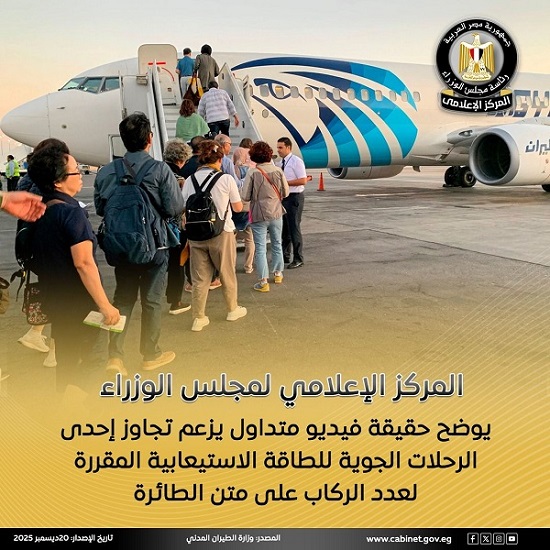 نشر المركز الإعلامي لمجلس الوزراء بيانًا عبر منصاته على مواقع التواصل الاجتماعي، أوضح من خلاله حقيقة مقطع فيديو متداول يزعم تجاوز إحدى الرحلات الجوية للطاقة الاستيعابية المقررة لعدد الركاب على متن الطائرة.