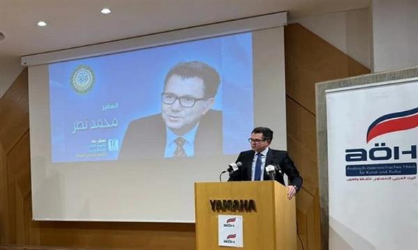 وأكد نصر في كلمته على أن اللغة العربية لم تكن يوما وسيلة تواصل بين الشعوب العربية فحسب، بل هي هوية وانتماء، ووعاء للفكر الحضارة، منوها بأهميتها التاريخية والممتدة كحلقة وصل بين الثقافات، وتحمل أمانة نقل الحضارة والمعرفة من جيل إلى جيل لما تمتلكه من مواطن ثراء وتجديد لغوي فريدة.