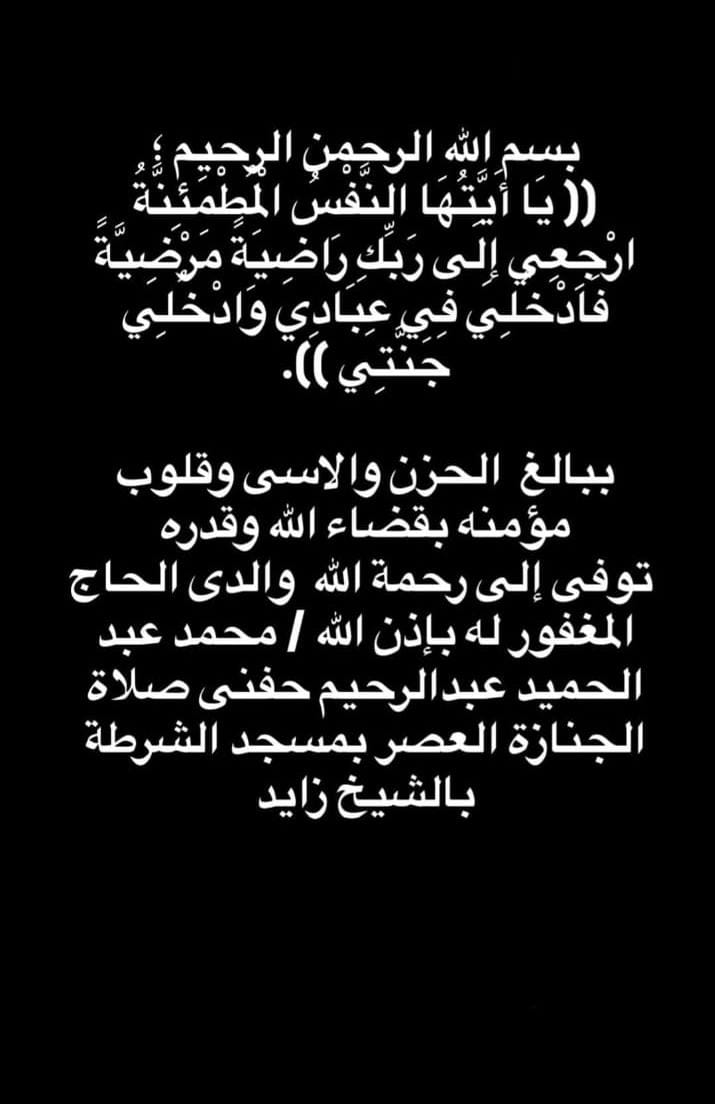 واضاف:"ببالغ الحزن والاسى وقلوب مؤمنه بقضاء الله وقدره توفى إلى رحمة الله والدي الحاج المغفور له بإذن الله / محمد عبد الحميد عبد الرحيم حفني صلاة الجنازة العصر بمسجد الشرطة بالشيخ زايد".