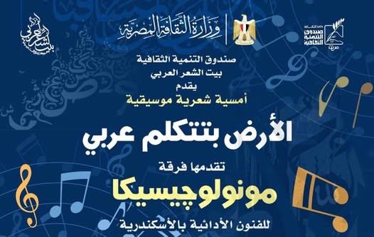 ينظم بيت الشعر العربي التابع لقطاع صندوق التنمية الثقافية بوزارة الثقافة، أمسية شعرية موسيقية بعنوان «الأرض بتتكلم عربي»، وذلك مساء اليوم الأحد 4 يناير، في تمام السابعة مساءً، بمقر بيت الشعر العربي خلف الجامع الأزهر، ويقام ذلك في إطار جهوده المتواصلة لدعم الإبداع الجاد وتعزيز حضور الشعر العربي في المشهد الثقافي المعاصر.