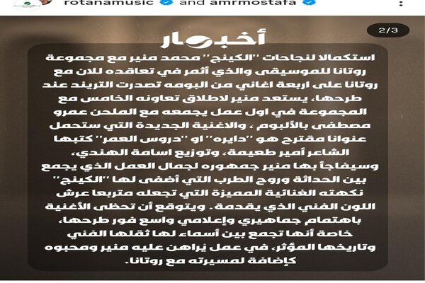 وكتبت روتانا عبر حسابها الرسمي على موقع إنستجرام: «استكمالًا لنجاحات الكينج محمد منير مع مجموعة روتانا للموسيقى، والتي أثمرت حتى الآن عن طرح أربعة أعمال تصدرت التريند وحققت صدى جماهيريًا واسعًا».
