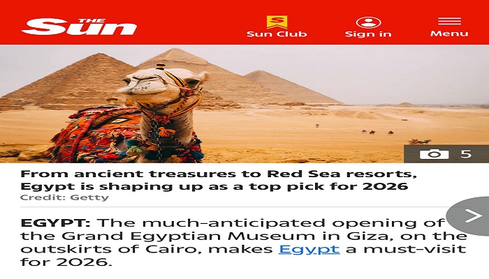 نشر موقع جريدة The Sun البريطانية، تقريرًا موسعًا استعرض من خلاله أفضل عشر وجهات سياحية عالمية يُنصح بزيارتها خلال عام 2026 لقضاء العطلات، وذلك وفقًا للقائمة التي أعدها اتحاد وكلاء وشركات السياحة والسفر البريطاني (ABTA)، حيث جاءت مصر ضمن هذه القائمة، تأكيدًا لمكانتها المتنامية على خريطة السياحة العالمية.