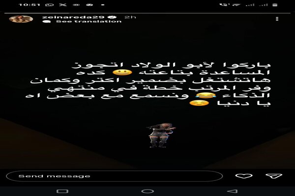 وكتبت عبر حسابها الرسمي على موقع التواصل الاجتماعي لتبادل الصور والفيديوهات الانستجرام: «باركوا لأبو الولاد اتجوز المساعدة بتاعته.. كده هتشتغل بضمير أكتر وكمان وفر المرتب، خطة في منتهى الذكاء، ونسمع مع بعض آه يا دنيا».