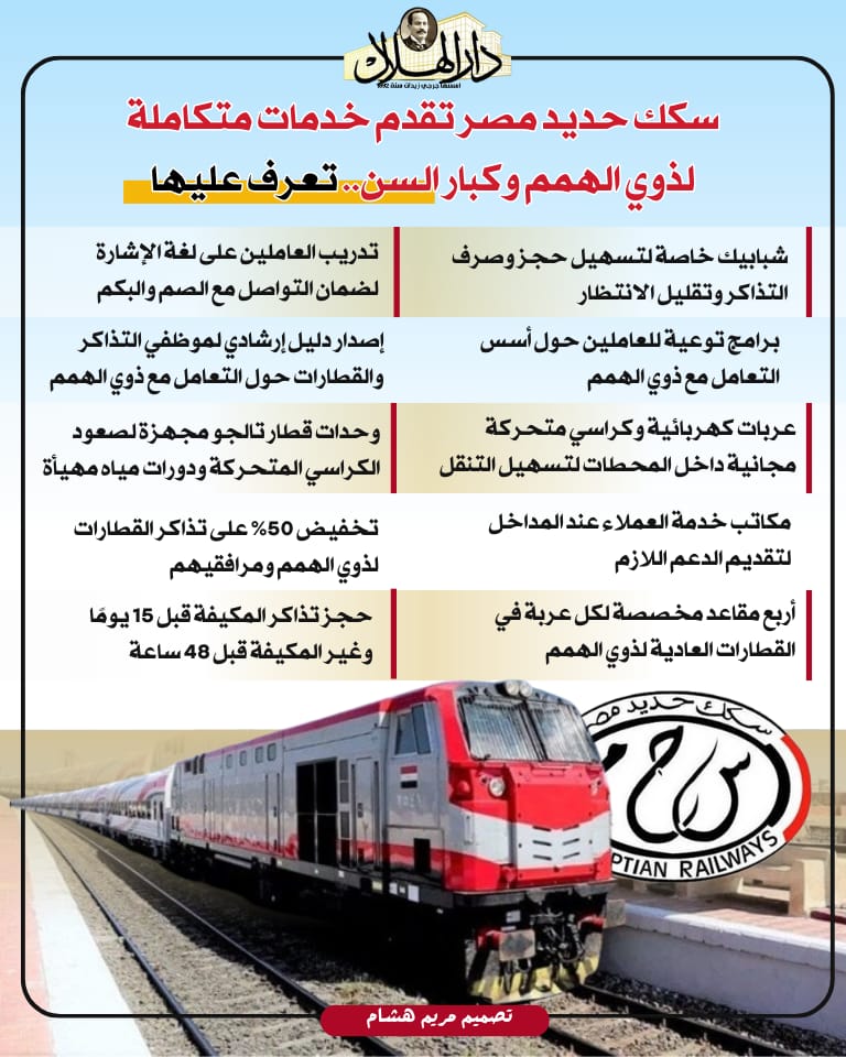 تحرص الهيئة القومية لسكك حديد مصر علي الارتقاء بالخدمات المقدمة لذوي الهمم، وكبار السن وذلك انطلاقًا من مسئوليتها نحو الاهتمام بهم وتعزيز حقوقهم وتقديم خدمة أكثر ملائمة لهم سواء داخل المحطات أو على متن قطارات هيئة السكك الحديدية وتنفيذ لتوجيهات وزارة النقل في هذا الإطار.