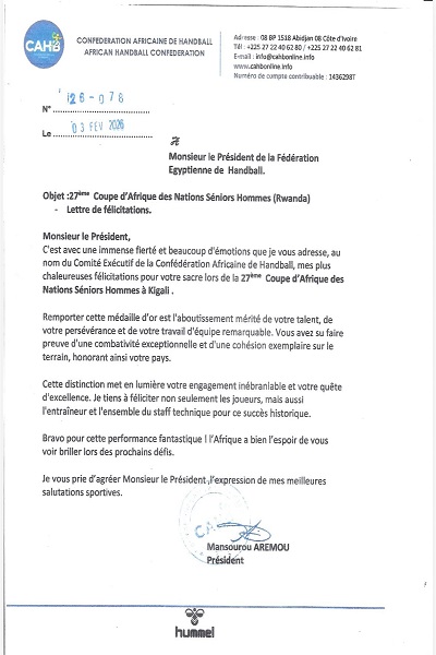 تلقى الاتحاد المصري لكرة اليد خطاب تهنئة رسمي من الاتحاد الأفريقي لكرة اليد، برئاسة منصور أريمو، بمناسبة تتويج منتخب مصر بلقب بطولة كأس الأمم الأفريقية لكرة اليد للرجال، التي أقيمت مؤخرًا في كيجالي عاصمة رواندا.