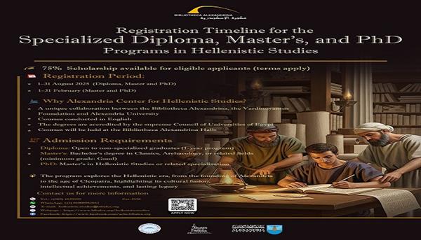 أعلنت مكتبة الإسكندرية من خلال مركز الإسكندرية للدراسات الهلينستية التابع لقطاع البحث الأكاديمي، عن فتح باب التسجيل لبرنامج الماجستير والدكتوراه في الدراسات الهلينستية من جامعة الإسكندرية، وذلك لخريجي الجامعات، في الفترة من 1 إلى 28 فبراير 2026.