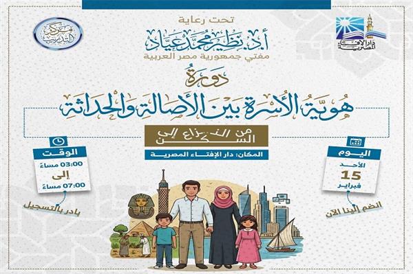 تحت رعاية فضيلة أ.د. نظير محمد عيَّاد، مفتي الجمهورية، رئيس الأمانة العامة لدُور وهيئات الإفتاء في العالم، تنظِّم دار الإفتاء المصرية دَورة تدريبية متخصصة بعنوان «هُوية الأسرة بين الأصالة والحداثة» والتي تنطلق يوم الأحد الموافق 15 فبراير 2026 فيما بين الساعة الثالثة عصرًا حتى السابعة مساءً وذلك في إطار جهود دار الإفتاء لتعزيز الاستقرار الأسري وتصحيح المفاهيم المرتبطة بالحياة الزوجية في ظل التغيرات الاجتماعية والفكرية المعاصرة.