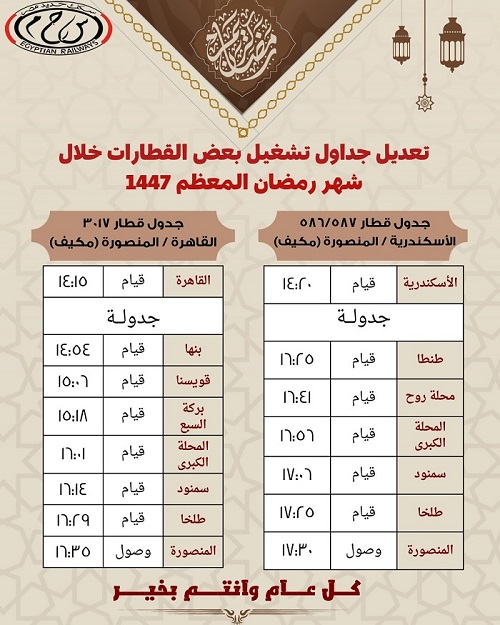 في إطار حرص الهيئة القومية لسكك حديد مصر التيسير على جمهور الركاب خلال شهر رمضان المبارك، تقرر تعديل مواعيد بعض القطارات على عدد من خطوط الشبكة بما يتماشى مع طبيعة التشغيل وخدمة جمهور الركاب خلال الشهر الكريم، وذلك اعتبارًا من يوم الاربعاء الموافق 18 فبراير 2026، ومع بدء شهر رمضان المعظم كالتالى: