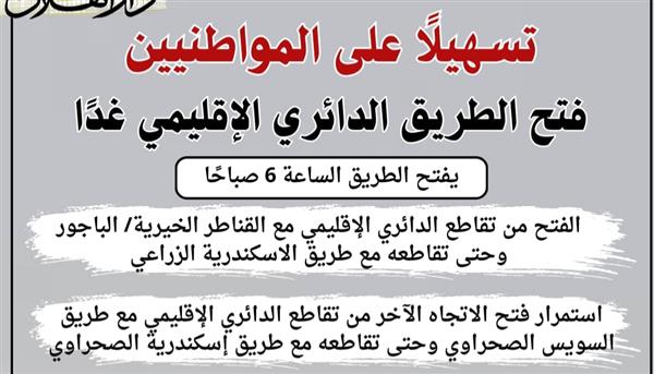 كما يستمر فتح الاتجاه الآخر من تقاطع الدائري الإقليمي مع طريق السويس الصحراوي وحتى تقاطعه مع طريق الإسكندرية الصحراوي.