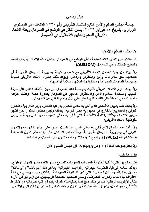 أصدر مجلس السلم والأمن التابع للاتحاد الأفريقي بيانين بشأن الجلستين الوزاريتين اللتين عُقدتا يوم ١٢ فبراير لمناقشة تطورات الأوضاع في كل من جمهورية الصومال الفيدرالية وجمهورية السودان، حيث تناول البيان مستجدات المشهدين السياسي والأمني في البلدين، وسبل دعم الجهود الوطنية الرامية إلى استعادة الاستقرار وتعزيز مؤسسات الدولة وصون وحدة وسلامة أراضيهما.