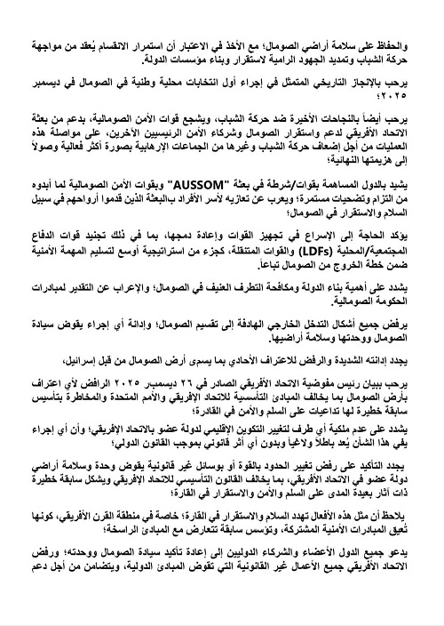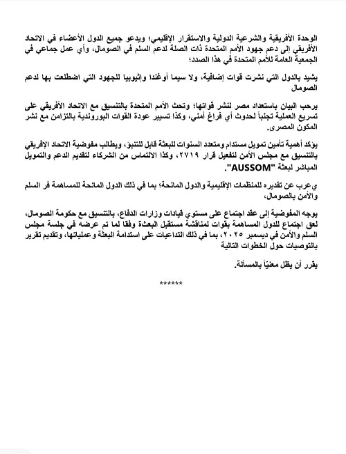 وقد تم اعتماد البيانين تحت الرئاسة المصرية للمجلس، فى انعكاس للدور الفاعل الذي تضطلع به مصر في دعم منظومة السلم والأمن الأفريقي، وحرصها على تعزيز التنسيق المشترك للتعامل مع الأزمات القائمة في القارة. وجدد المجلس التزامه بمواصلة متابعة تطورات الأوضاع في الصومال والسودان، وتفعيل الأدوات المتاحة للاتحاد الأفريقي لدعم مسارات الحلول السياسية والحفاظ على استقرار المنطقة.
