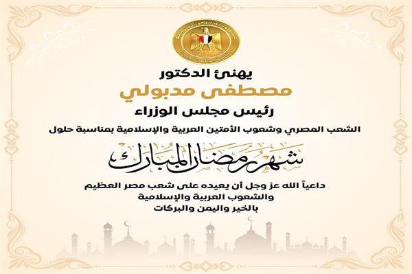 هنأ رئيس مجلس الوزراء الدكتور مصطفى مدبولي، الشعب المصري وشعوب الأمتين العربية والإسلامية بمناسبة حلول شهر رمضان المبارك.
