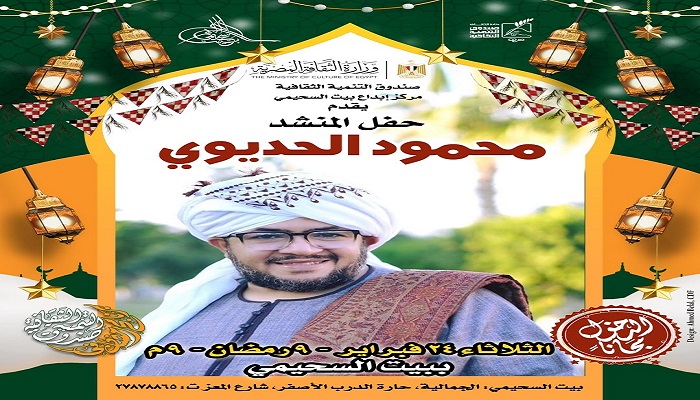 وفي بيت السحيمي، يحيى المنشد محمود الحديوي وفرقته الموسيقية حفلاً للإنشاد الديني، ويعد الحديوي أحد أبرز وجوه فن المديح النبوي في مصر، وله حضور بارز في صعيد البلاد.