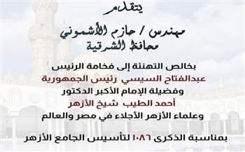 محافظ الشرقية يهنئ رئيس الجمهورية بمناسبة الذكرى الـ 1086 لتأسيس الجامع الأزهر