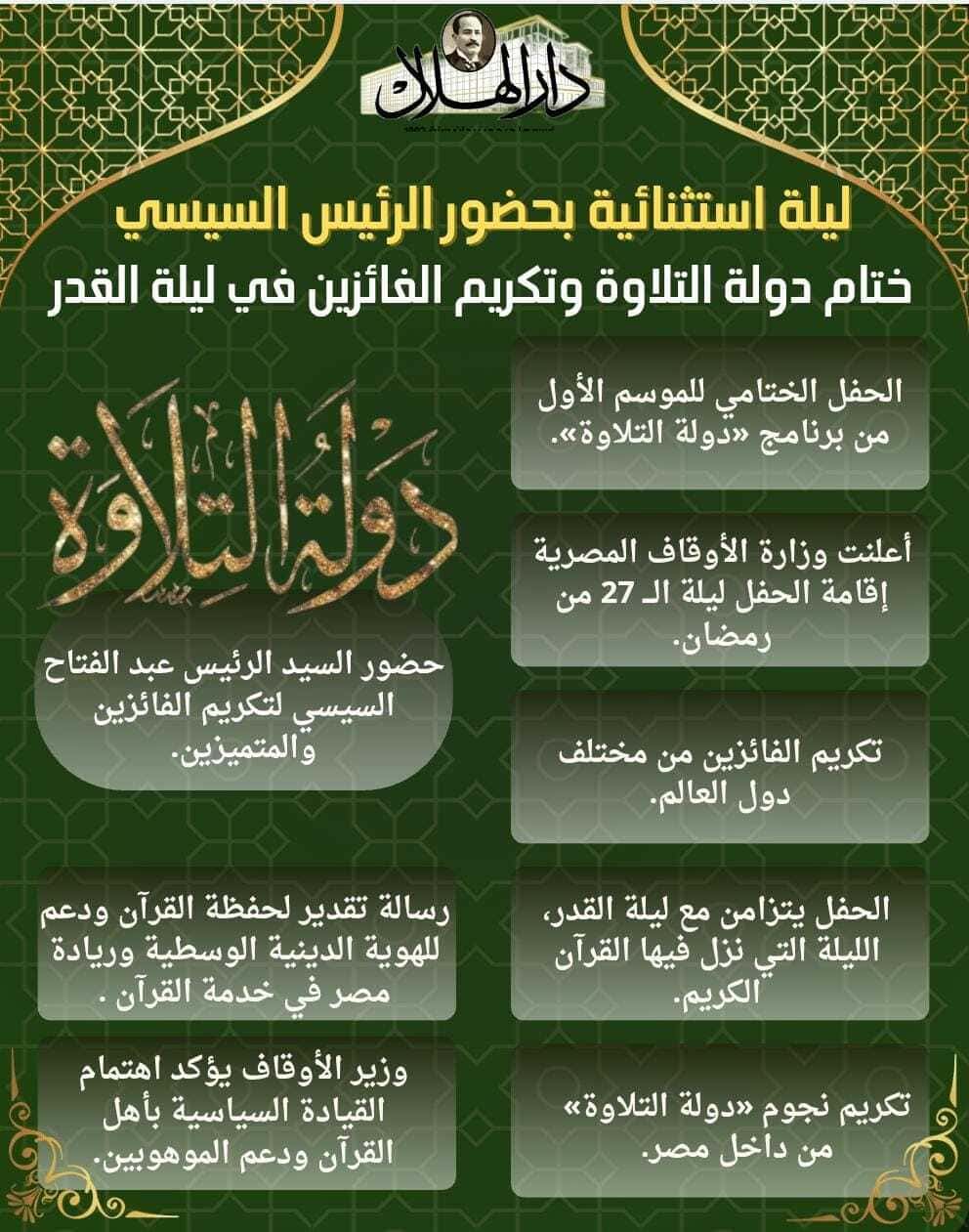 وسيقام ختام دولة التلاوة وتكريم الفائزين في ليلة القدر في ليلة استثنائية بحضور الرئيس السيسي، لختام للموسم الأول من برنامج «دولة التلاوة»، وسيكون برنامج الحفل كما يلي: