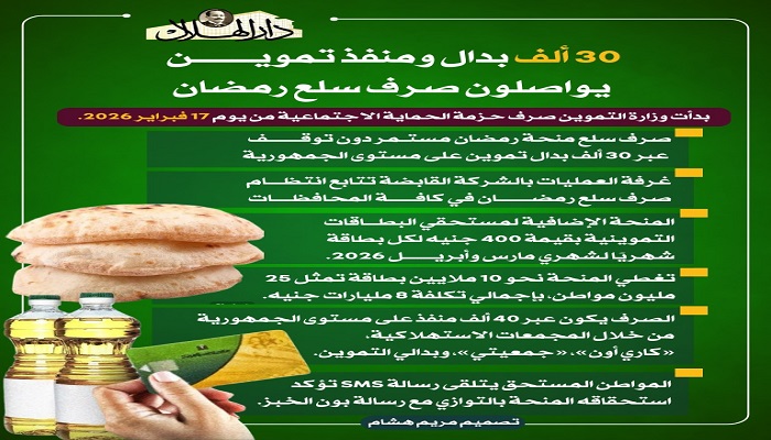 تواصل وزارة التموين صرف حزمة الحماية الاجتماعية المخصصة لشهر رمضان المبارك، والتي بدأت منذ يوم 17 فبراير 2026، عبر 30 ألف بدال تموين و40 ألف منفذ على مستوى الجمهورية، بما يشمل المجمعات الاستهلاكية و«كاري أون» و«جمعيتي» وبدالي التموين.