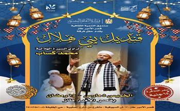 يقدم قصر الأمير طاز عرض «السيرة الهلالية» مع الحكاء محمد كساب، ضمن فعاليات الليلة العاشرة من برنامج صندوق التنمية الثقافية الرمضاني.
