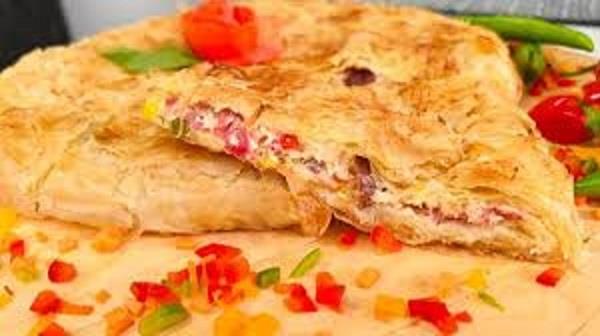 -يقطع الفطير إلى مثلثات كبيرة، ثم يحشى بقطع الأومليت مع الخضروات المقطعة والجبن المبشور، ويدخل الفرن حتى تذوب الجبن ويسخن جيدًا.