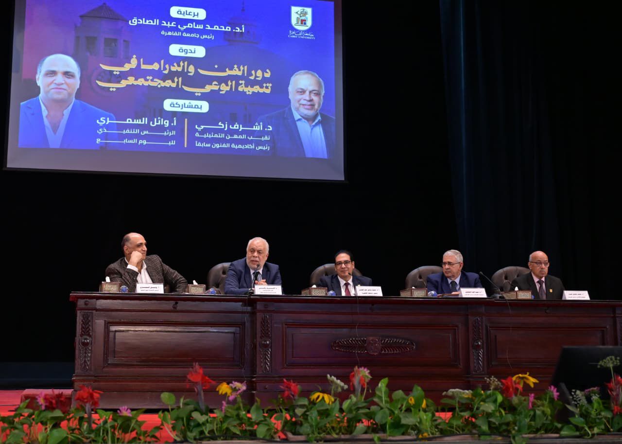 وفي مستهل كلمته، رحب الدكتور محمد سامي عبدالصادق، بالدكتور أشرف زكي والاستاذ وائل السمري فى رحاب جامعة القاهرة العريقة، مؤكدًا أهمية موضوع الندوة لكونها تتناول دور الفن والدراما اللذين يؤثران تأثيرًا كبيرًا علي وعي ابناء الوطن، ومشيرًا إلى أن النشاط المسرحي بجامعة القاهرة جزء أصيل من رسالتها التعليمية والتنويرية، ولا يمكن أن يتوقف، وأن مهرجان العروض المسرحية ينطلق بكامل طاقته بمختلف الكليات اعتبارًا من 3 مايو المقبل. وأضاف أن الفن الهادف قوة حقيقية في تشكيل الوعي وبناء القيم، وجامعة القاهرة كانت ولا تزال مصنعًا لنجوم الفن والإبداع.